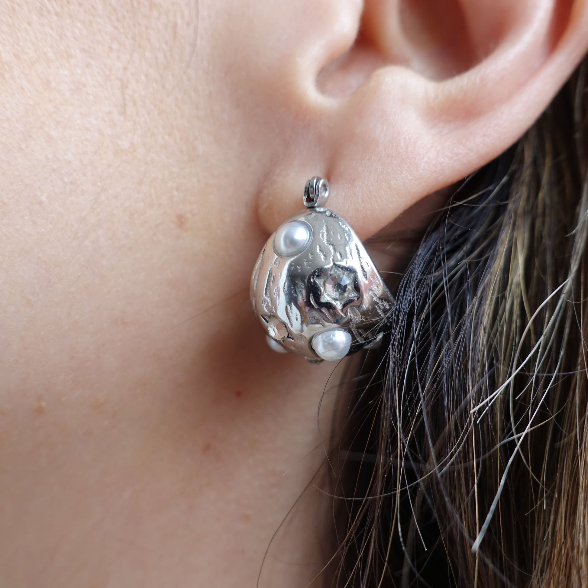 Thick stainless steel hoop earrings with pearls around them