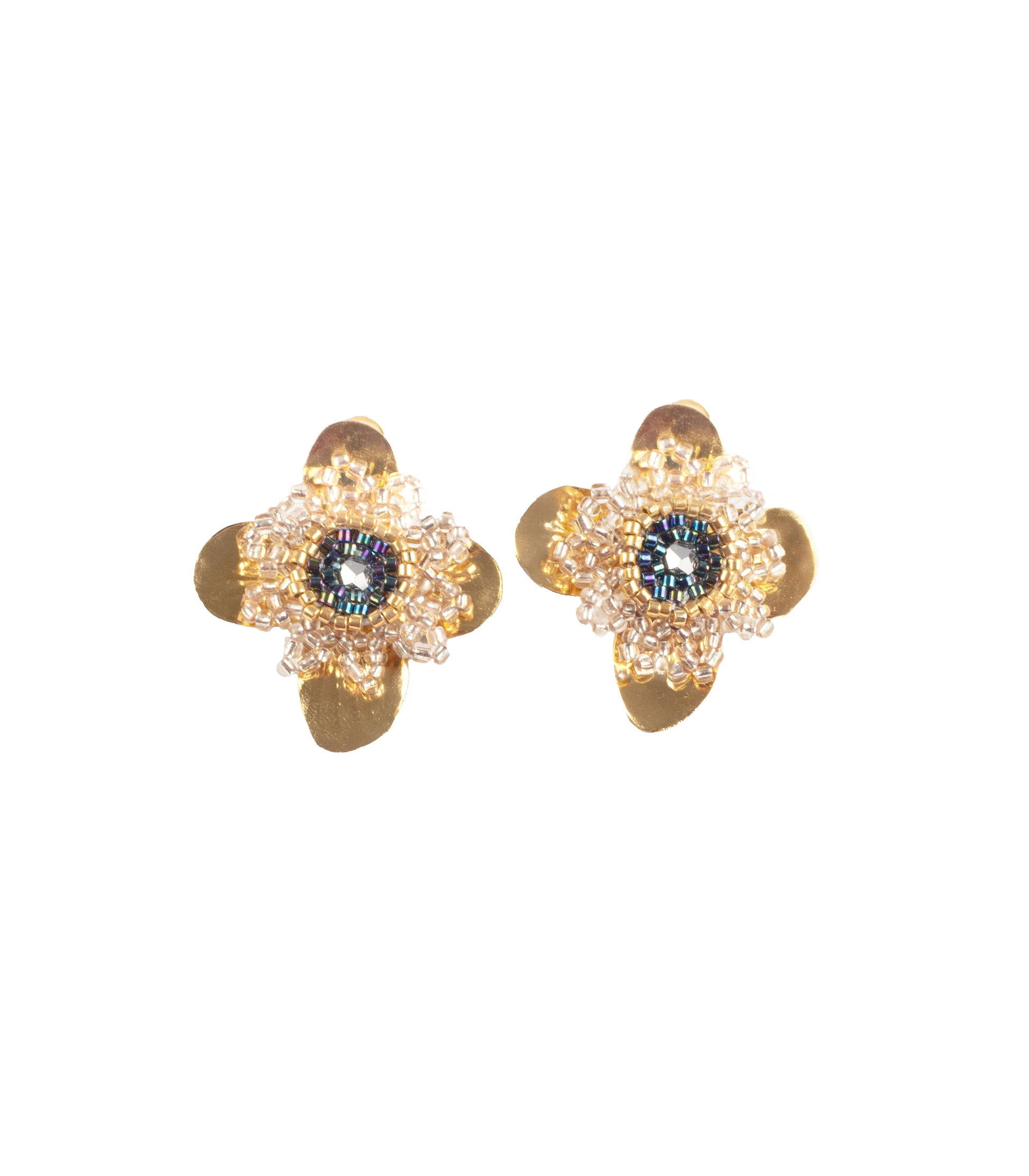Gold-plated flower-shaped earrings with white, gold, and blue accents