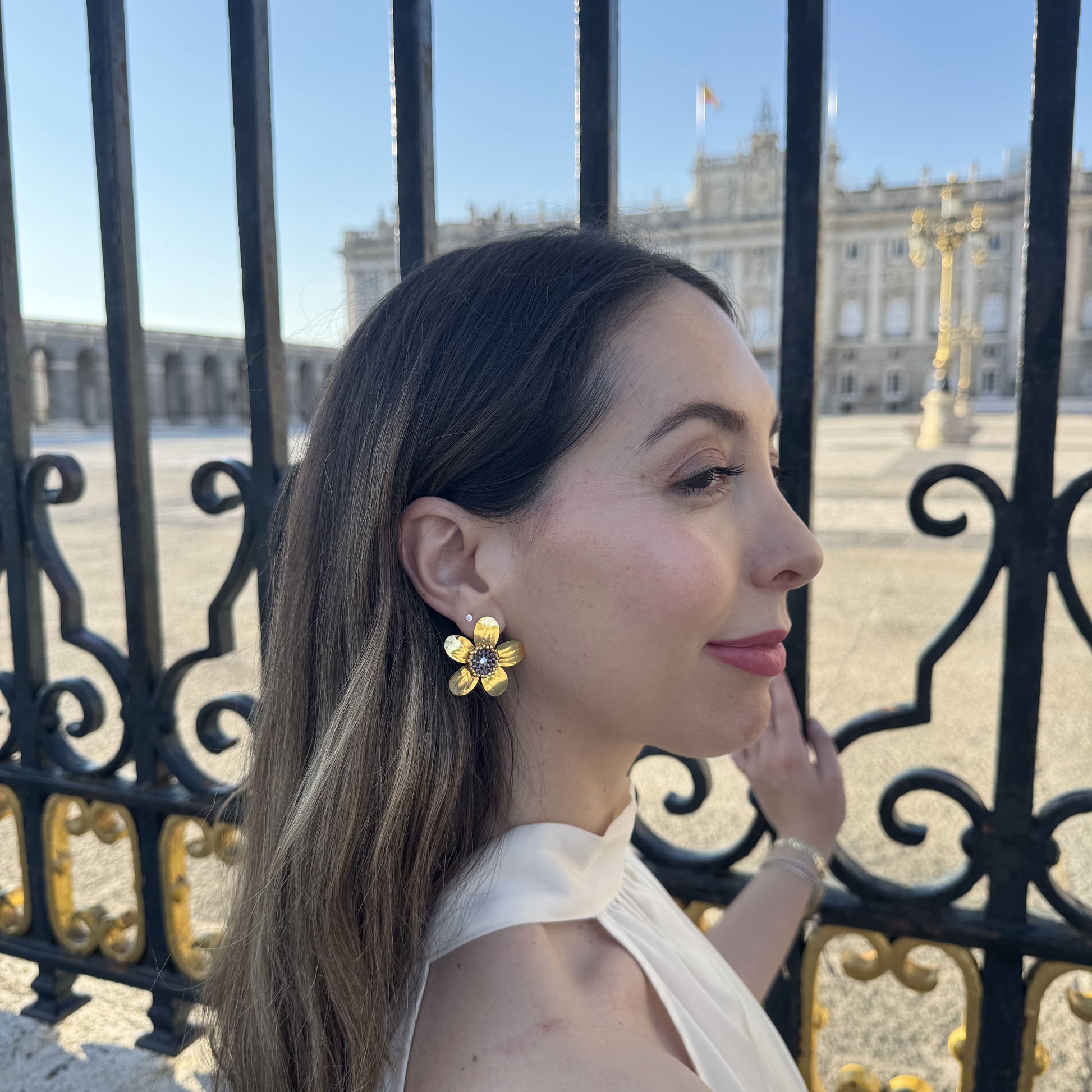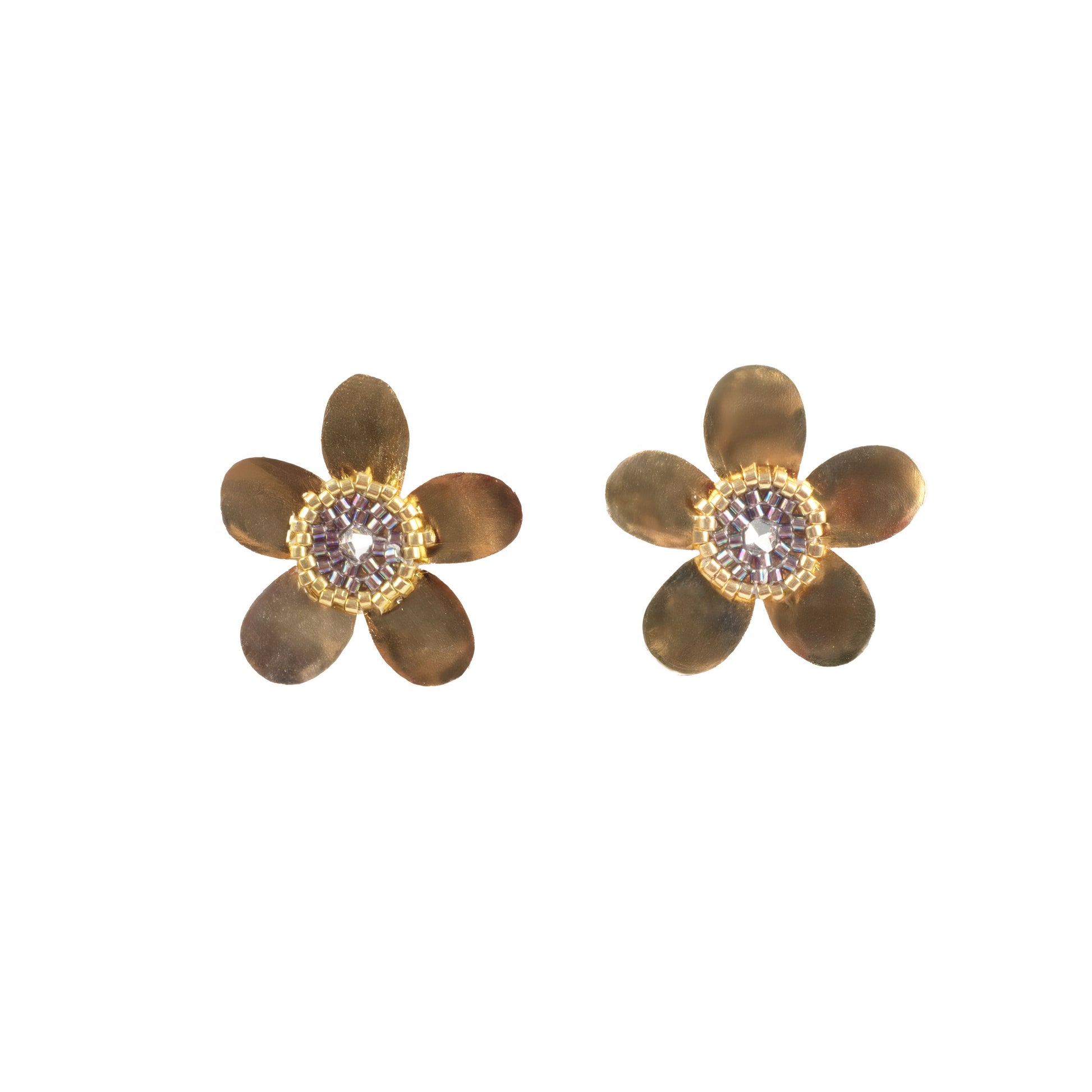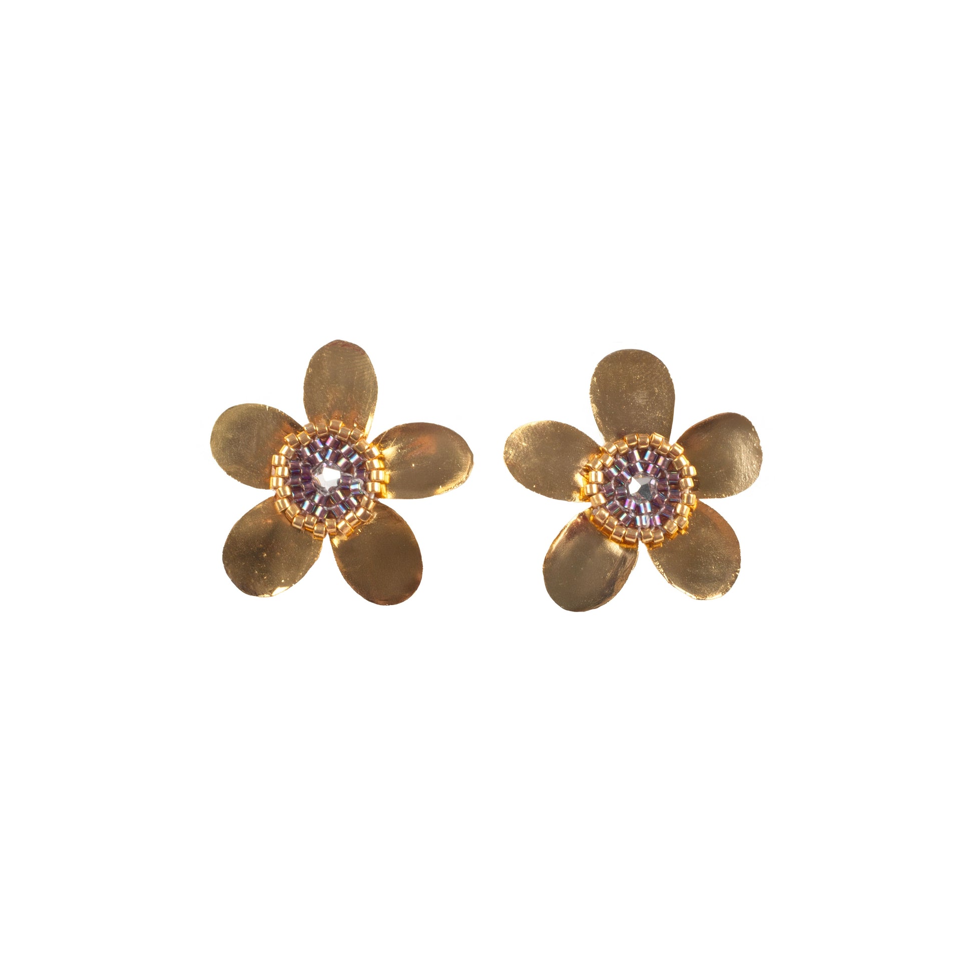 Pendientes chapadas con un ligero toque en lila, armado en torno a un detalle floral