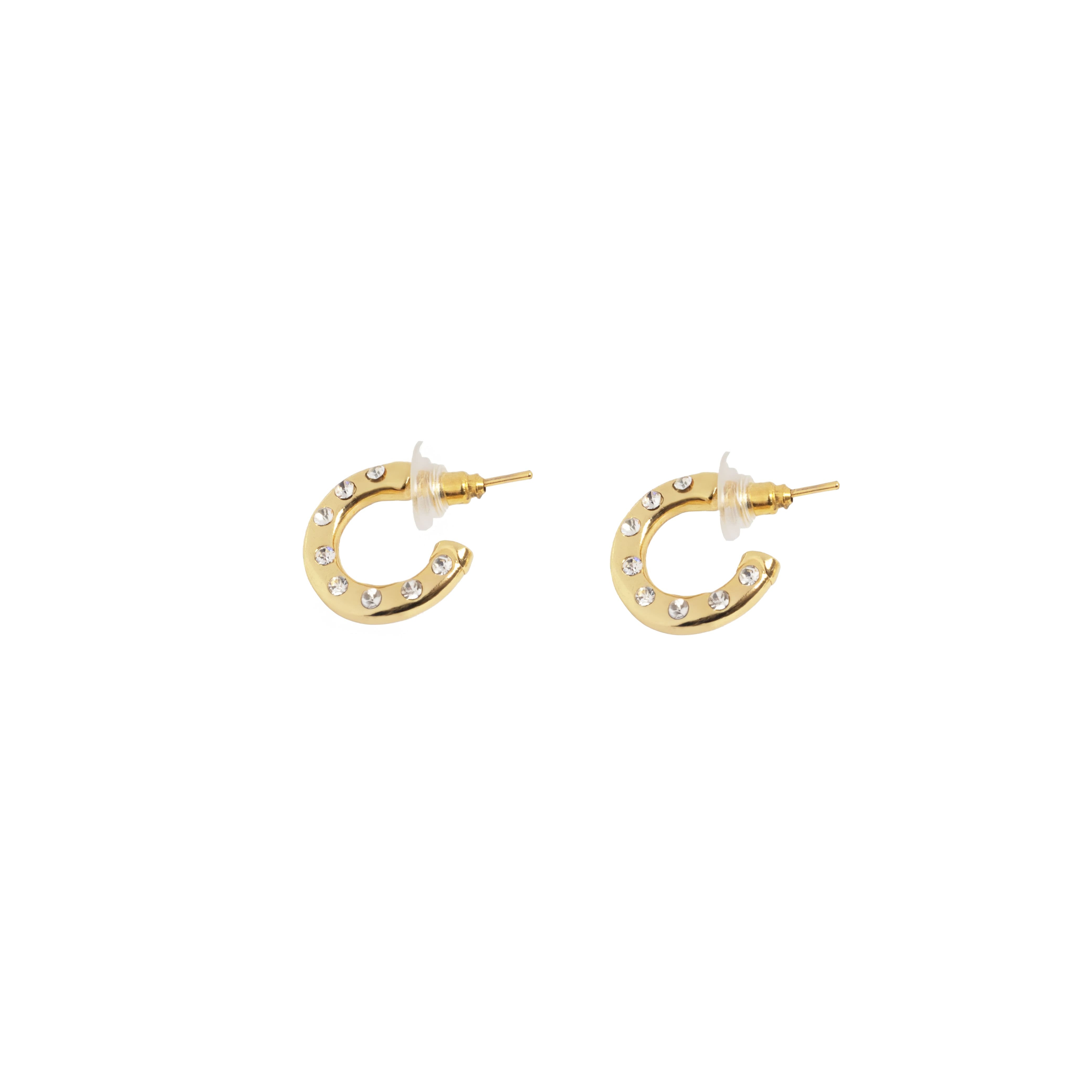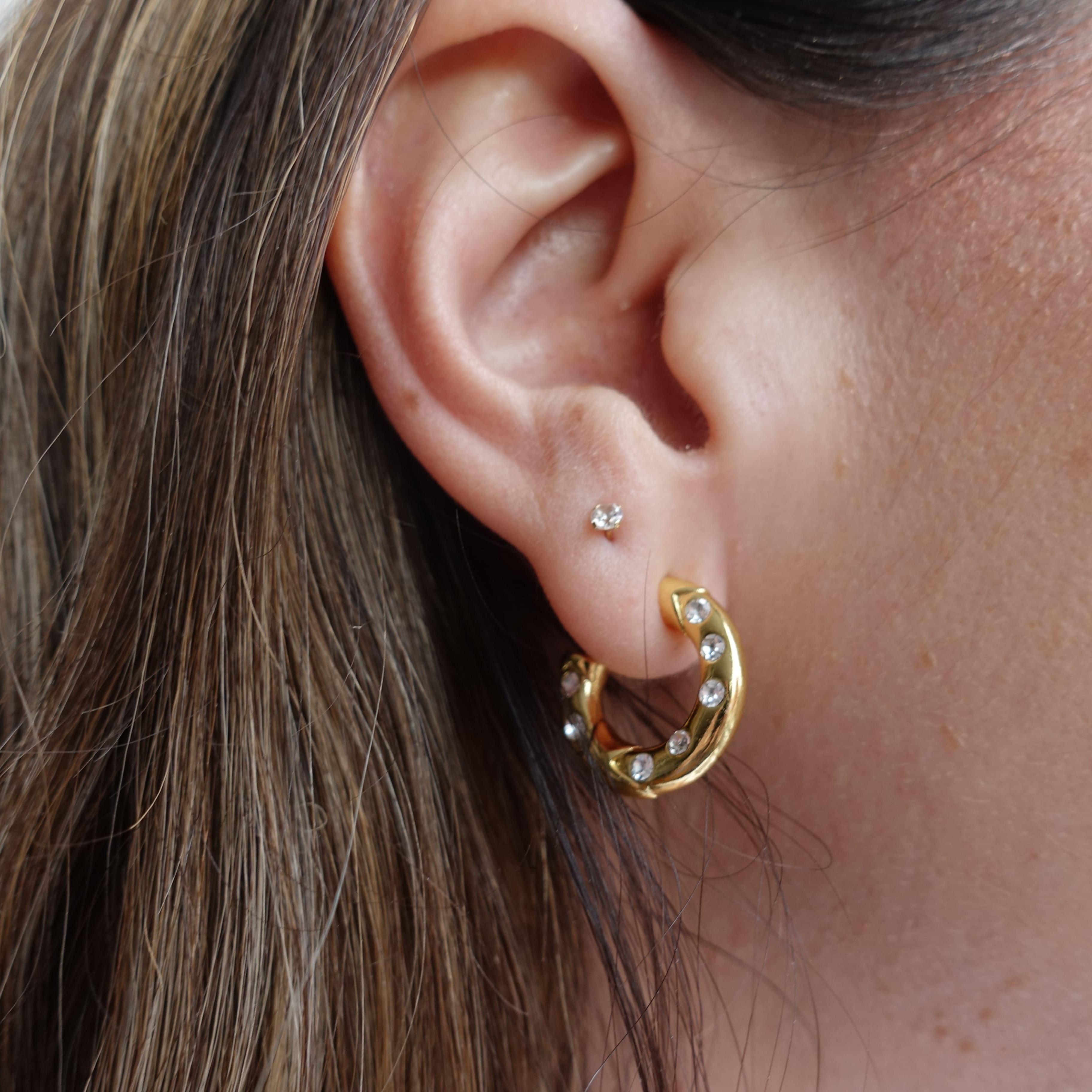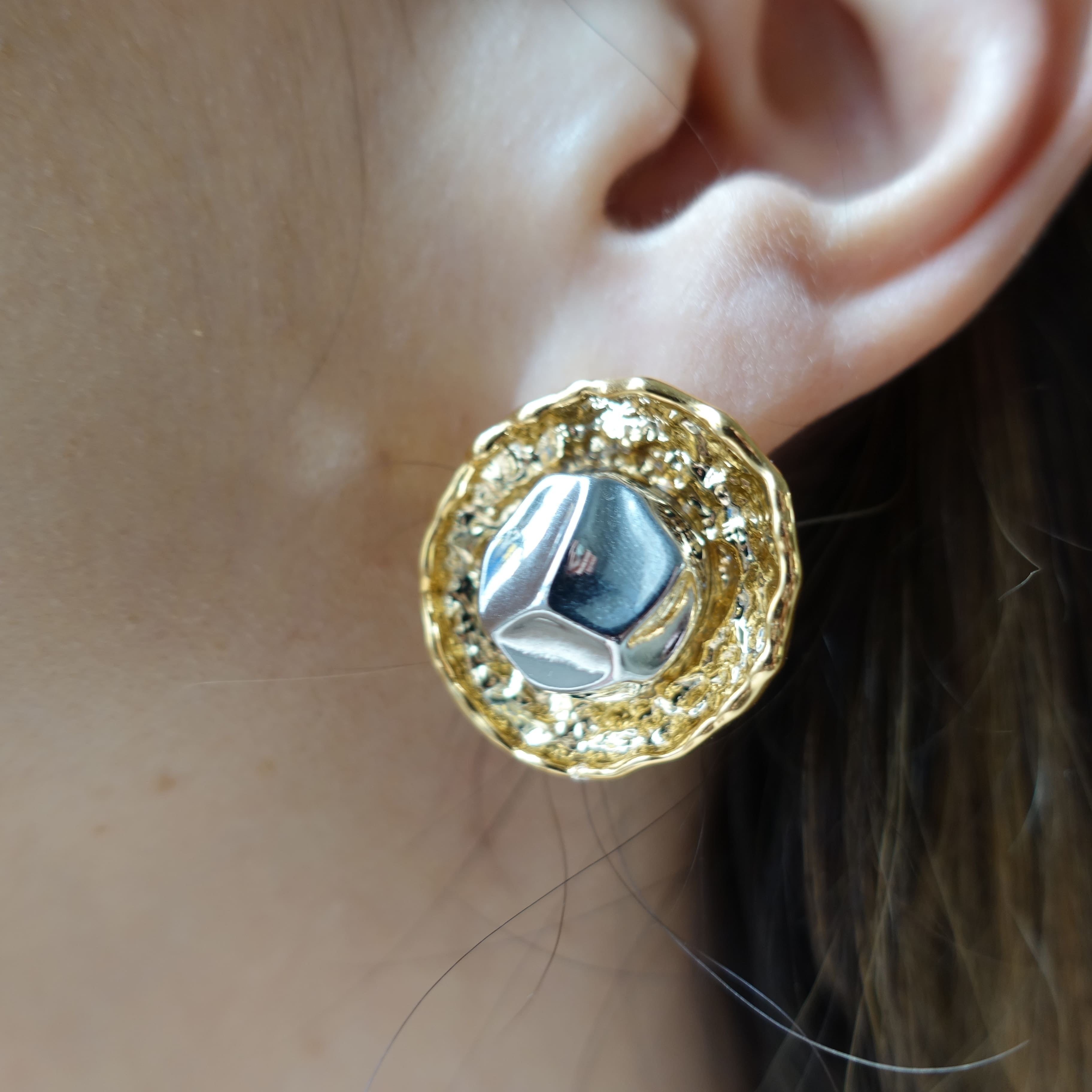 Pendientes chapadas con un ligero toque en lila, armado en torno a un detalle floral
