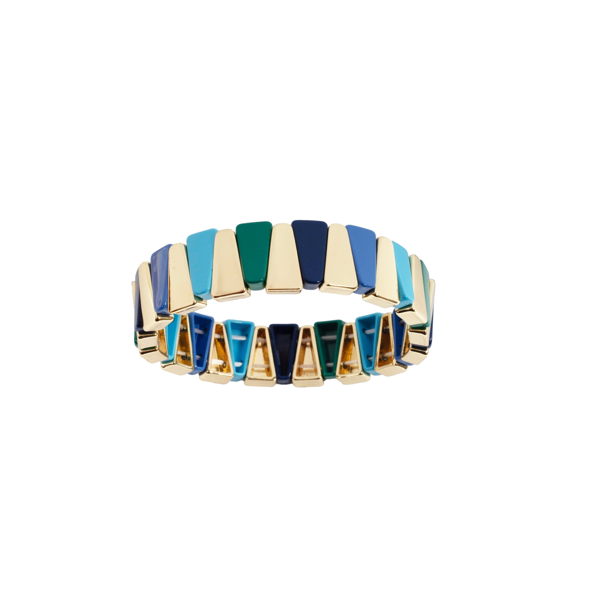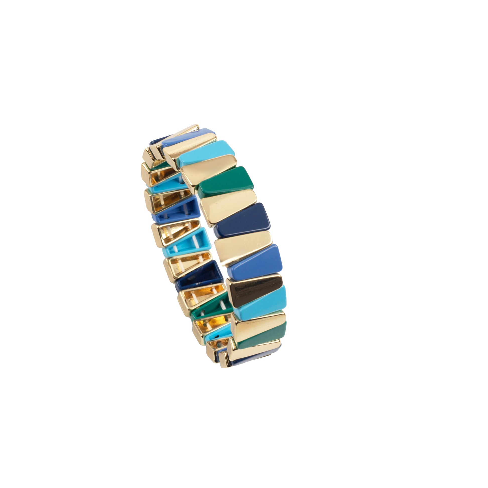 Pulsera en diferentes tonalidades de azul, verde y dorado en material de resina